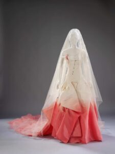 El vestido de seda se componía de un corpiño ajustado con tirantes que desembocaba en una falda voluminosa. La parte inferior del diseño presentaba un efecto de Tie-dye en color rosa que rompía con el tradicional blanco de los vestidos de novia. El look lo completó con un velo de encaje antiguo que decoraba su cabello platino, recogido en un moño alto. El diseño de Galliano, que rompía por completo con la tradición nupcial, se ha convertido en uno de los más icónicos de las últimas décadas.
